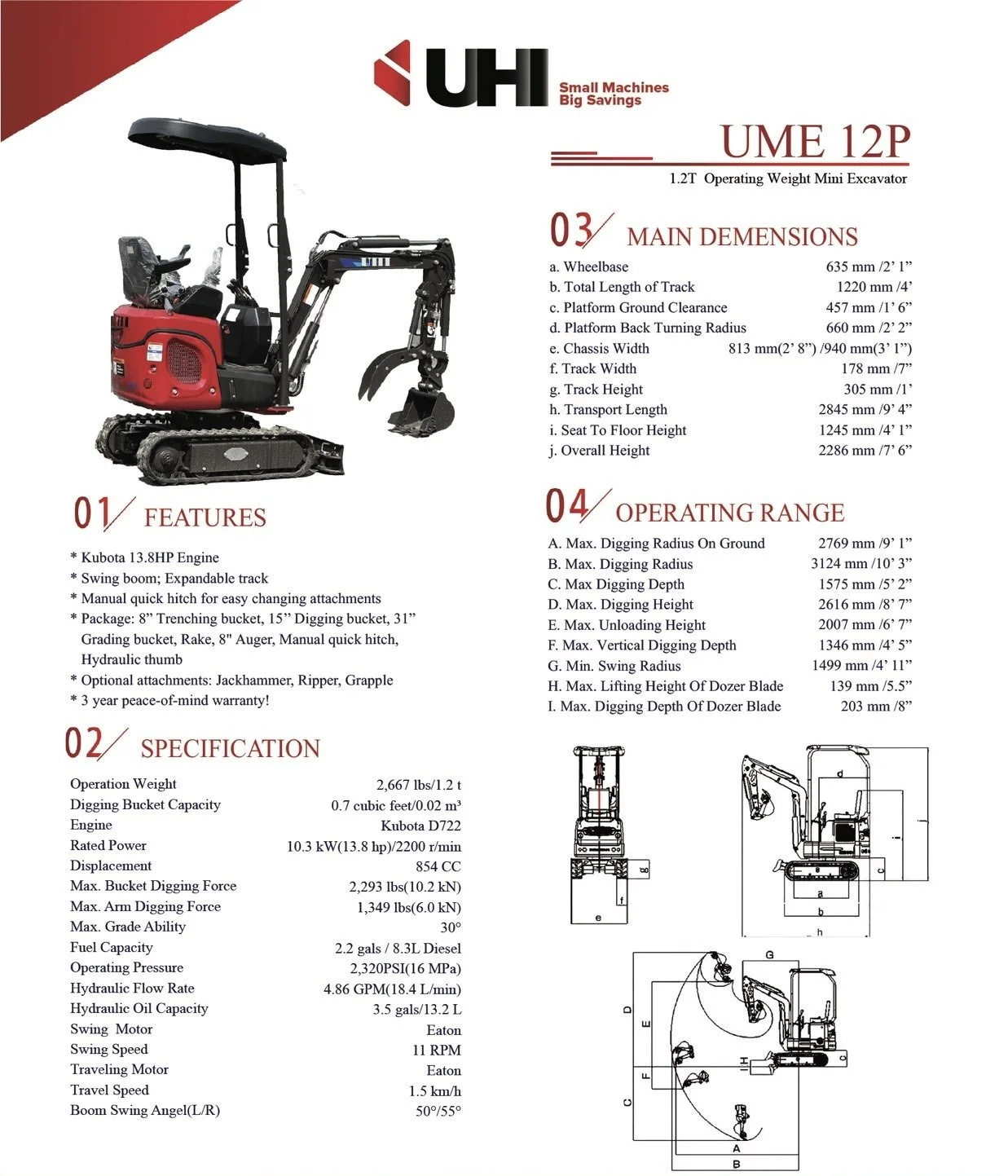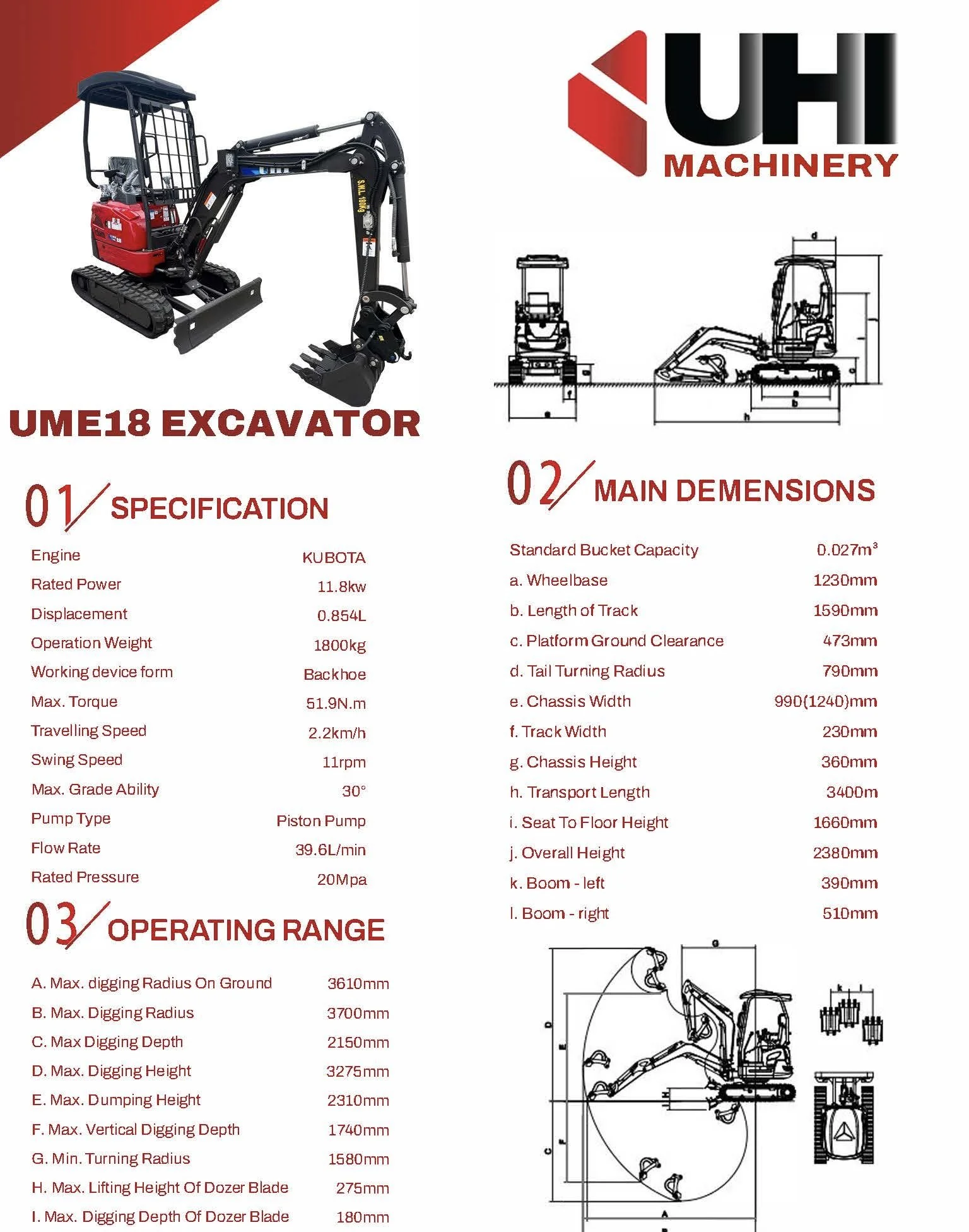 The UME18 mini excavator is equipped with a powerful 16 horsepower Kubota diesel engine. This reliable, liquid-cooled, 3-cylinder engine delivers consistent performance, ensuring efficiency and durability for various construction tasks.